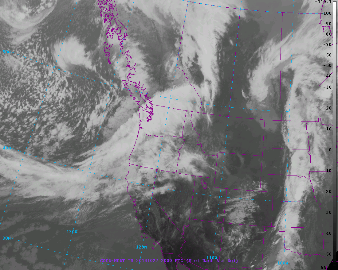An infrared satellite picture at 1 PM his afternoon shows the plume of moisture extending into our region, and lots of unstable air behind it over the Pacific, which will be moving in tomorrow.