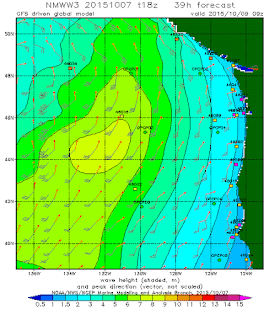 One impact from Oho will be waves that will propagate to our coast as long period swell. Here is a prediction from the NOAA Wavewatch III model for early Saturday morning. The yellows are 8 meter waves...around 25 ft. This swell will reach the WA coast on Saturday possibly causing beach erosion and dangerous breaking waves.