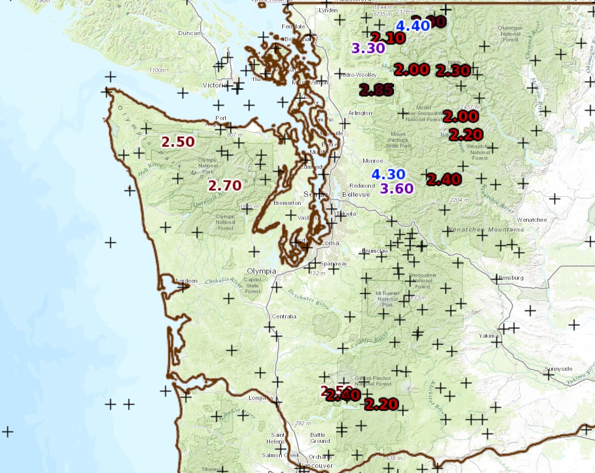 The rainfall totals for the 24-h ending 6 AM this morning (Sunday) were impressive (see regional and close in maps below). 1-1.5 inches over Puget Sound and 2-4 inches over the western slopes of the Olympics and the Cascades.